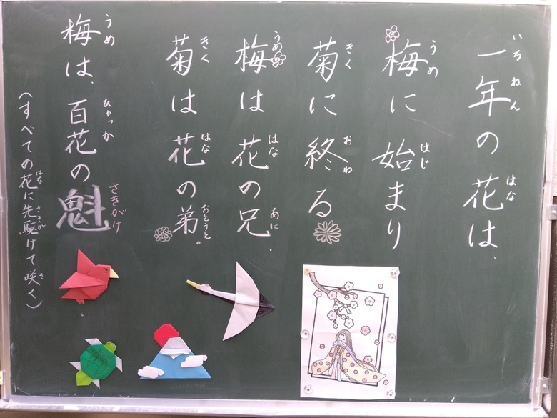 2026/02/17 ブログ と 黒板標語 東風ふかば においおこせよ 梅の花 あるじなしとて 春なわすれそ 菅原道真公 京都は黄色のロウバイから香りが始まり、白梅、紅梅、しだれ梅と続きます、1年に先駆けて咲くので、百花の魁(さきがけ)というそうです。 お知らせ・催事情報一覧へ戻る